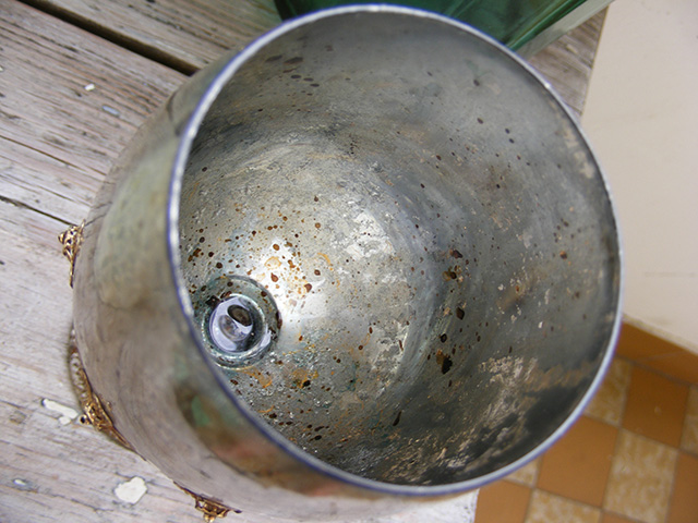 Kieliszek skromniejszy, na szybko na spotkaniu czarownic zrobiony, gdyż prezentem szybko musiał zostać. Krylon, srebrna folia, srebrna pasta pozłotnicza, bronza, bitum.
